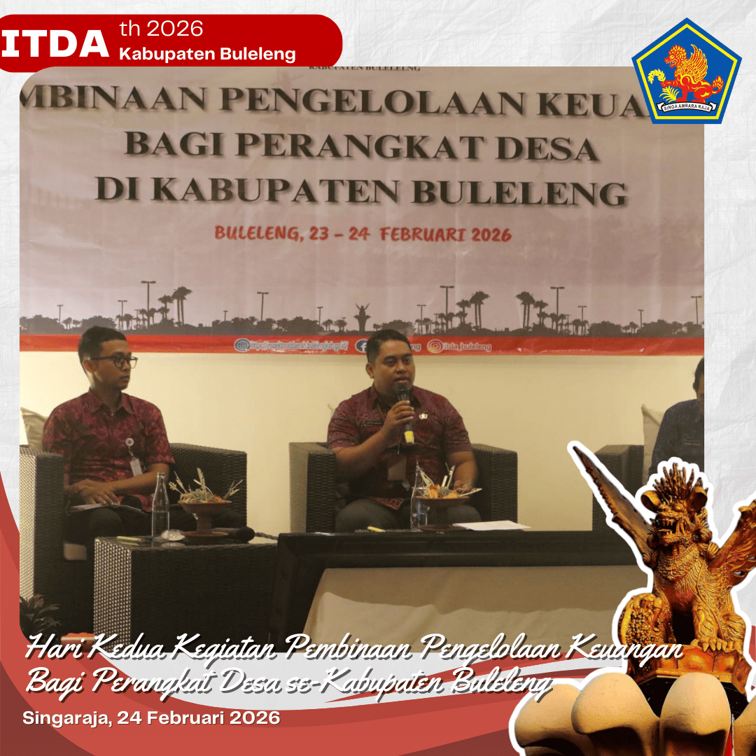 Singaraja, Senin 23 Febuari 2026 Bertempat di Hotel Banyualit, hari pertama kegiatan Pembinaan Pengelolaan Keuangan bagi Perangkat Desa se-Kabupaten Buleleng resmi dilaksanakan dengan dihadiri oleh Sekretaris Desa se Kabupaten Buleleng secara luring dan Kaur/Kasi Pemerintah Desa secara daring. Kegiatan ini menghadirkan narasumber dari BAPPEDA Kabupaten Buleleng dan Badan Pengawasan Keuangan dan Pembangunan (BPKP) Provinsi Bali. Pembinaan bertujuan meningkatkan pemahaman dan kapasitas aparatur desa dalam pengelolaan keuangan yang transparan, akuntabel, serta sesuai regulasi yang berlaku. Melalui kegiatan ini diharapkan tata kelola keuangan desa semakin tertib dan profesional guna mendukung pembangunan desa yang berkelanjutan.