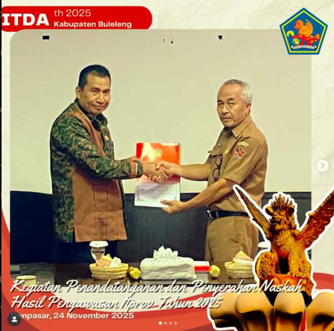 Denpasar, Senin 24 November 2025 Bertempat ruang rapat Sabha Adhyasta Madya Inspektorat Provinsi Bali, telah dilaksanakan Penyerahan Naskah Hasil Pemeriksaan “Pengawasan Umum dan Teknis Penyelenggaraan Urusan Pemerintahan Daerah Tahun 2025” , yang di hadirin langsung Inspektur Daerah Kabupaten Buleleng I Putu Karuna, acara di buka dan dipimpin langsung Inspektur Provinsi Bali I Wayan Sugiada, dilanjutkan penandatanganan dan penyerahan berita acara Naskah Hasil Pemeriksaan Tahun 2025.