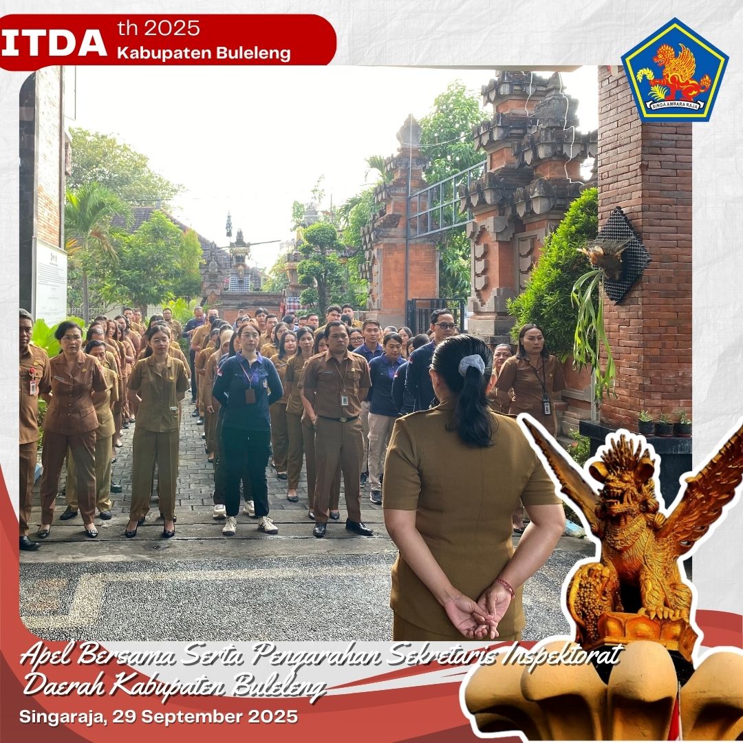 bertempat halaman kantor Inspektorat Daerah Kabupaten Buleleng dilaksanakan kegiatan apel bersama yang di pimpin Sekretaris Inspektorat Daerah Kabupaten Buleleng Ni Made Susi Adnyani, dalam kesempatan ini disampaikan beberapa hal tentang kehadiran pegawai ASN dalam pelaksanaan apel pagi agar senantiasa mempertahankan kedisiplinan sebagai ASN serta penyampaian kepada seluruh ASN di lingkungan Inspektorat Daerah Kabupaten Buleleng untuk selalu bijak dalam menggunakan media sosial. Setelah apel, dilanjutkan persembahyangan bersama.