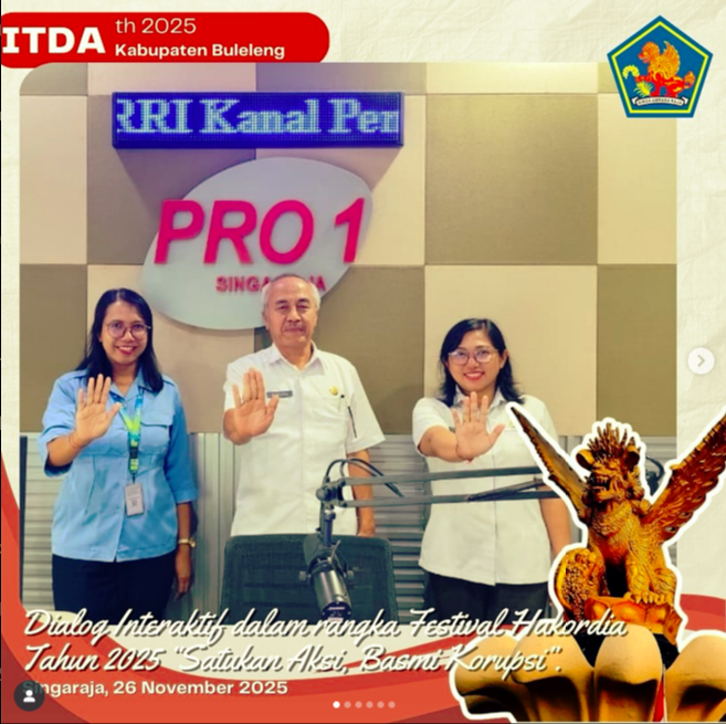 Bertempat RRI Singaraja dilaksanakan Dialog Interaktif dalam rangka Festival Hakordia Tahun 2025 “Satukan Aksi, Basmi Korupsi”. Kegiatan diisi Inspektur Daerah Kabupaten Buleleng I Putu Karuna bersama Sekretaris Inspektorat Daerah Kabupaten Buleleng Ni Made Susi Adnyani dengan Host Heny Batalia. Diharapkan melalui dialog interaktif RRI Singaraja pada 26 November 2025, berharap tercipta ruang diskusi yang produktif, terbuka, dan edukatif. Semoga setiap gagasan yang disampaikan dapat memberikan manfaat bagi masyarakat, memperkuat kolaborasi antar pemangku kepentingan, serta mendorong terciptanya solusi nyata bagi perkembangan daerah Kabupaten Buleleng.