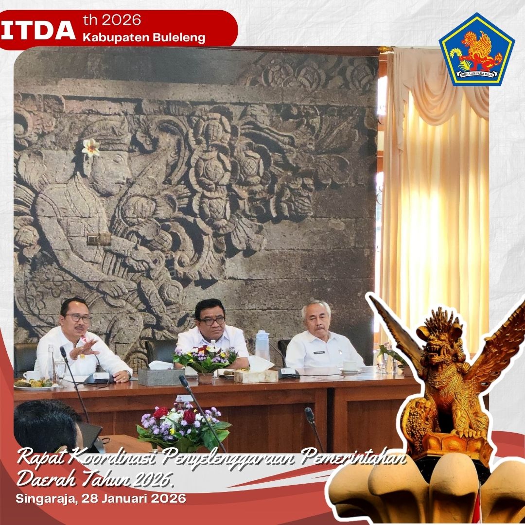 Bertempat di Rumah Jabatan Bupati Buleleng, telah dilaksanakan kegiatan koordinasi penyelenggaraan Pemerintahan Daerah Tahun 2026. Kegiatan ini dilaksanakan sebagai upaya menyelaraskan pelaksanaan tugas pemerintahan daerah seiring dengan penyesuaian Organisasi Perangkat Daerah (OPD) yang baru. Koordinasi tersebut membahas sejumlah agenda strategis, antara lain penataan aset daerah terkait penyesuaian OPD yang baru, penyusunan anggaran daerah sejalan dengan struktur OPD yang baru, persiapan pelaksanaan Musyawarah Perencanaan Pembangunan (Musrenbang) tingkat kecamatan, serta persiapan pelaksanaan Audit Badan Pemeriksa Keuangan (BPK) Tahun 2026. Kegiatan koordinasi dipimpin oleh Sekretaris Daerah Kabupaten Buleleng, Gede Suyasa, didampingi oleh Inspektur Daerah Kabupaten Buleleng, I Putu Karuna. Dalam arahannya, Sekda Buleleng menekankan pentingnya sinergi dan kesiapan seluruh perangkat daerah dalam mendukung tata kelola pemerintahan yang tertib administrasi, transparan, dan akuntabel. Melalui kegiatan ini, diharapkan seluruh OPD di lingkungan Pemerintah Kabupaten Buleleng dapat memahami langkah-langkah strategis yang perlu dilakukan dalam rangka mendukung kelancaran penyelenggaraan pemerintahan daerah Tahun 2026.