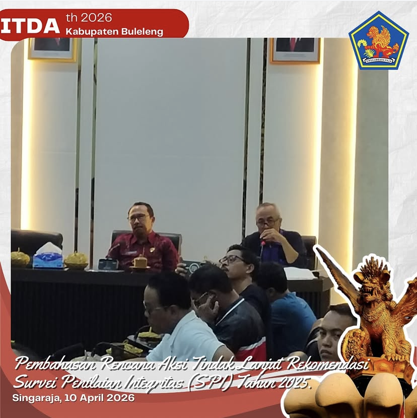 Singaraja, 10 April 2026 telah dilaksanakan kegiatan pembahasan Rencana Aksi Tindak Lanjut Rekomendasi Survei Penilaian Integritas (SPI) Tahun 2025. Kegiatan tersebut berlangsung di ruang rapat Badan Perencanaan Pembangunan Daerah (Bappeda) Kabupaten Buleleng. Rapat dipimpin langsung oleh Sekretaris Daerah Kabupaten Buleleng Gede Suyasa bersama Inspektur Daerah Kabupaten Buleleng I Putu Karuna, serta dihadiri oleh jajaran perangkat daerah terkait. Pembahasan ini bertujuan untuk menindaklanjuti berbagai rekomendasi hasil SPI 2025 sebagai upaya memperkuat tata kelola pemerintahan yang bersih, transparan, dan akuntabel. diharapkan seluruh perangkat daerah di Kabupaten Buleleng dapat memperkuat sinergi dan meningkatkan kinerja dalam mewujudkan pemerintahan yang berintegritas serta berorientasi pada pelayanan publik yang optimal.
