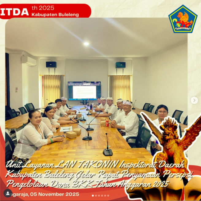 Rabu, 05 November 2025 bertempat diruang rapat Inspektorat Daerah Kab. Buleleng, Tim LAN TAKONIN menyelenggarakan rapat koordinasi pembahasan jawaban atas pertanyaan dan konsultasi yang diajukan oleh Pemerintah Desa melalui Layanan LAN TAKONIN bersama tim dari Dinas Pemberdayaan Masyarakat dan Desa. Melalui rapat koordinasi ini, diharapkan memiliki persepsi yang sama terkait solusi atas permasalahan permasalahan yang dihadapi oleh Pemerintah Desa, sehingga dapat memberikan nilai tambah dana rekomendasi bagi terwujudnya tata kelola pemerintah desa yang akuntabel